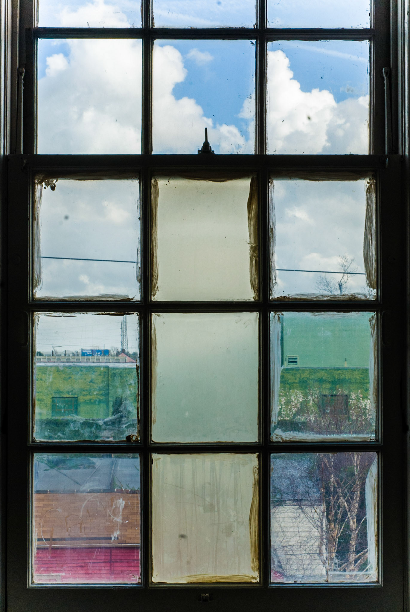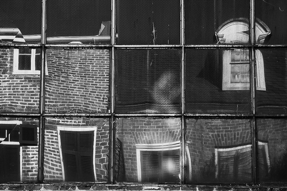 Reflection of typical canal houses in the sideview mirror of a scooter.